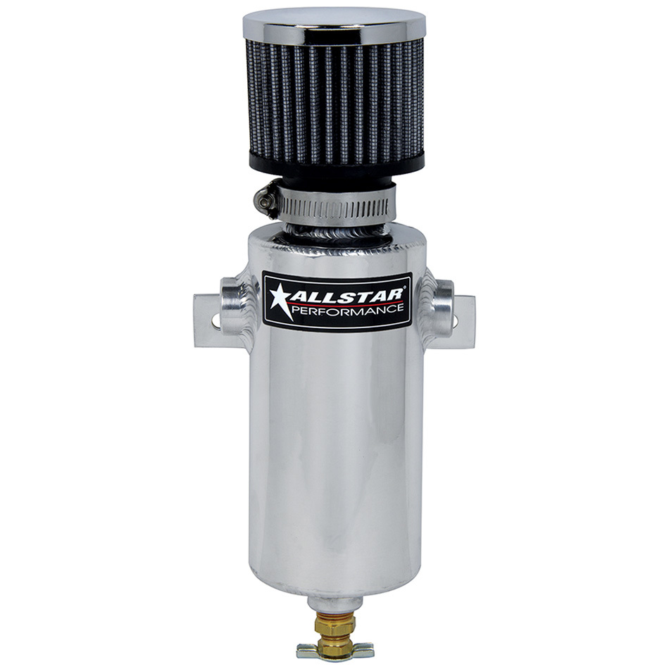 Breather Tank – Bolt-On – 3 in Diameter x 11.5 in Tall – 40 oz – Two 3/8 in NPT Female Inlets – Petcock Drain – Breather Included – Aluminum – Natural – Each