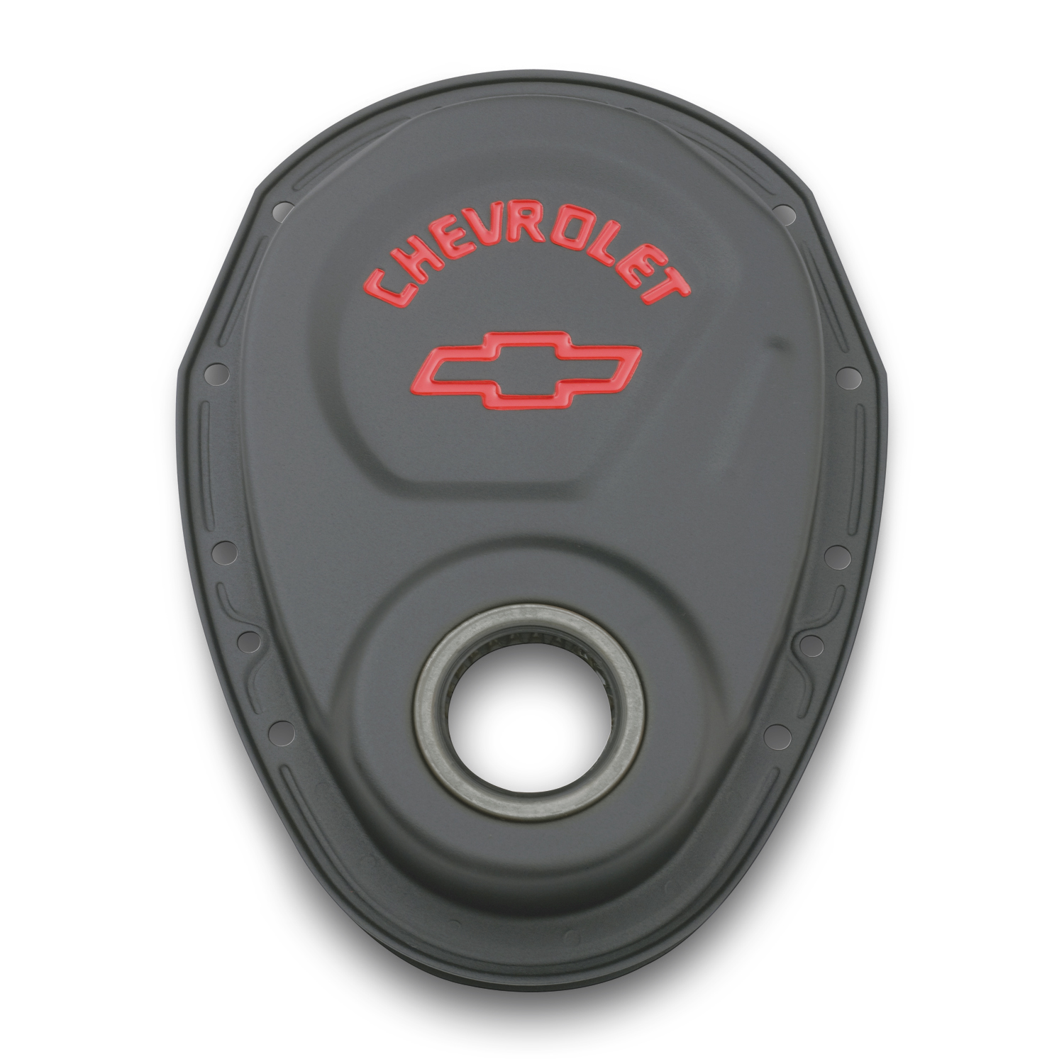 Timing Cover – 1-Piece – Seal Included – Chevrolet / Bowtie Logo – Steel – Black Crinkle Paint – Small Block Chevy – Each