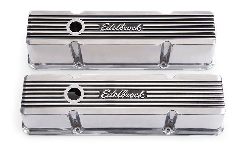 Valve Cover – Elite II – Tall – Finned – Baffled – Breather Hole – Edelbrock Logo – Aluminum – Polished – Small Block Chevy – Pair